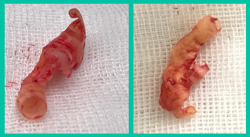 Şah damarında tıkanıklık olan bir hastanın ameliyatında damar içerisinden çıkartılan kolesterol plağı. Aşağıdaki resimde görülen, damarın içini adeta bir boru gibi saran bu kolesterol plağı çıkarıldıktan sonra damarın üst kısmı bir sentetik yama ile kapatıldı.