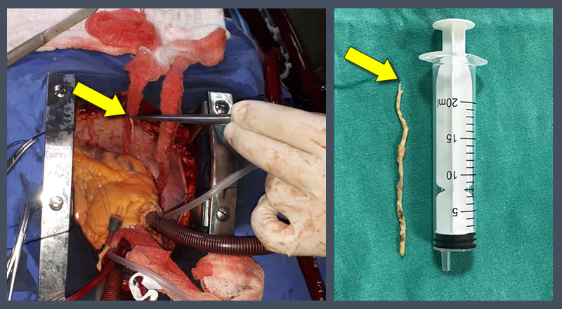 Koroner bypass ameliyatı esnasında, koroner damar içerisinden çıkarılan uzun bir plak aşağıda sağdaki resimde görülmektedir. Soldaki resim ise plağın kalpteki koroner damar içerisinden çıkarılmasını göstermektedir. Bu plak nedeniyle koroner damar tamamen tıkanmış durumdaydı. Bu uzun plak çıkartıldıktan sonra bacaktan alınan damar ile bypass yapılabilecek bir alan sağlanabildi.